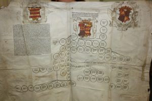Manuscrit et imprimé du XVIe siècle.Pièce de procès sur vélin, in-plano, avec arbre généalogique complété à la main, blasons. Procès de la succession Maison d'Armagnac et Du Gout.