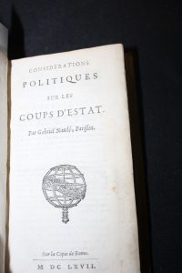 Naude (Gabriel) :Considérations politiques sur les coups d’état.(A la sphère). Sur la copie de Rome, 1667, in-12 vélin.