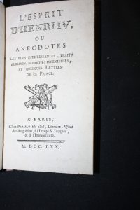 Prault (L. Laurent) :L’Esprit d’Henri IV, ou Anecdotes les plus intéressantes, traits sublimes, réparties ingénieuses et quelques lettres de ce Prince.Paris, Prault, 1770, in-8 basane marbrée, 1ère édition de cet ouvrage souvent...