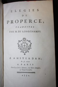 Properce :Elégies. Traduites par Longchamps.Amsterdam, Le Jay, 1772, in-8 veau marbré, latin et français.