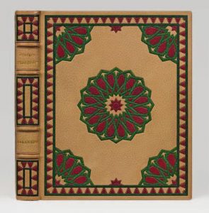 Flaubert (Gustave). Salammbô. Paris, Devambez, 1926. In-4, maroquin beige, soleil rouge entouré d’une forme géométrique mosaïquée rouge et verte, ornement dans les angles et large encadrement dans le même goût, dos orné,