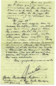 Lettre autographe signée de Gaston Bachelard à Claude Tarnaud alors en Somalie relative à The White Gambler. « Je me suis rajeuni dans votre miroir. On respire mieux quand la langue est mobile, libre, rendue à la jeunesse des mots. Avec vous, les images, enfin, commandent…je suis un bien vieux philosophe mais à vous lire je m’enchantais de parler. Je voudrais faire une synthèse des cinq livres que j’ai écrit sur l’imagination du feu de l’eau de l’or et de la terre. Des notations comme celle de la page 50 m’ouvrent un horizon. »
