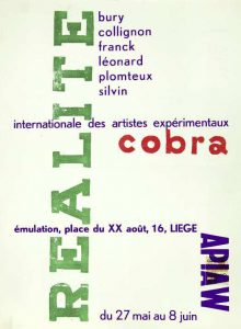 Cobra Realite. Affiche Realite Apiaw de l’exposition internationale des artistes expérimentaux Cobra : Bury, Collignon, Franck, Leonard, Plomteux, Silvin, Liège, Salle des expositions de l’Émulation. 42 x 31 cm, sous passe-partout.
