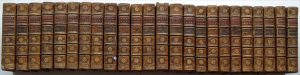 Gras ou Desprez, 1739-1754 (T. 1 à 20). Suivi de : LA VILLE (J. C. de). Continuation des Causes Célèbres et Interessantes ... Paris, Desaint, 1766 (t. 1), Le Clerc, 1769 (t. 2 et 3), Amsterdam, Rey, 1770 (t. 4). 24 volumes in-12, reliure de l’époque veau brun marbré, dos à 5 nerfs orné, pièce de titre maroquin bordeaux, armoiries sur les plats des tomes 1 à 20. Epidermures superficielles sur presque tous les volumes, petits manques de cuir sur 4 volumes, pièces de tomaison frottées, qq. trous de vers, coins plus ou moins usés selon les volumes. L’ensemble en bon état intérieur, hormis des petites galeries de vers sur deux volumes. Au nombre des nombreuses affaires décrites, on trouve celles de Martin Guerre, Urbain Grandier, Louis Gaufridy (sorcellerie), la conspiration de Cinq-Mars et de Thou, la Liberté réclamée par un Nègre contre son maître qui l’a amené en France, suivi du célèbre Code Noir, ou Edit du Roi servant de règlement pour le gouvernement, et l'administration de la Justice & de la Police des Isles Françoises de l'Amérique., le différend de Furetière avec l'Académie Française, le procès de Marie Stuart, etc. Barbier I, 541.