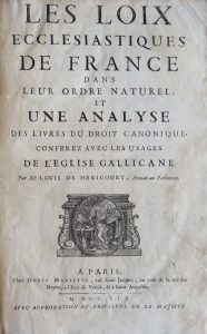 [DROIT]. HERICOURT (Louis de). Les Loix Ecclesiastiques de France dans leur ordre naturel et une Analyse des Livres du Droit canonique, conferez avec les usages de l’Eglise gallicane. Paris, Denis Mariette, 1719. In-folio, reliure de l’époque...