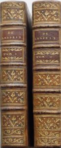 [HELVETIUS (Claude-Adrien)]. De l’Esprit. T. 1 : Amsterdam, Arkstée & Merkus, 1758. T. 2 : Paris, Durand, 1758. 2 volumes in-12, reliure de l’époque veau marbré, dos à nerfs orné, pièce de titre maroquin bordeaux. Légères craquelures sur...