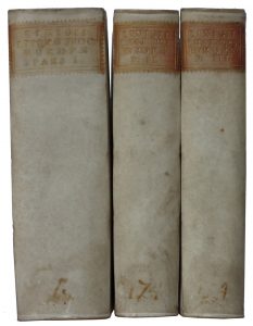 Lætitiæ, quam Tristitiæ casibus, nec non Belli ac Pacis negotiis, itemque Religionis causa, Ab Anno 1552. usque ad Annum 1712. Latina lingua exaratæ, in tres partes divisæ, et in lucem editæ a Jo. Christiano Lünig. Lipsiæ (Leipzig), J.F. Gleditsch et filium, 1712. 3 volumes in-8, reliure vélin blanc rigide, titre doré au dos sur fond rouge (passé) simulant des pièces de titre, tranches rouges. Accroc sur un mors. (64)-1072 pp.; (32)-638 pp.; (22)-646 pp. Feuillets parfois un peu brunis. Bandeaux, lettrines et culs-de-lampe sur bois gravés. Bel exemplaire. Recueil de lettres et discours des empereurs, électeurs, princes et hommes d'état du Saint-Empire Romain germanique échangés ou adressés aux dirigeants européens, classés par ordre chronologique de 1551 à 1712.