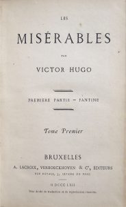 HUGO (Victor). Les Misérables. Bruxelles, Lacroix, Verboeckhoven, 1862. 10 tomes en 5 volumes in-12, reliure demi-chagrin vert, dos à 5 nerfs orné de fleurons dorés. Coiffes frottées, coins émoussés. Édition in-12 peu courante publiée à la...