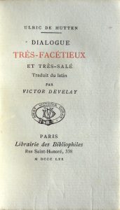HUTTEN (Ulrich de). Dialogue très-facétieux et très-salé. Traduit du latin par Victor Develay. Paris, Librairie des Bibliophiles, 1870. In-32, broché. 56 pp. Vignette en frontispice. Edition tirée à 510 ex. dont celui-ci, un des 500 ex. sur...