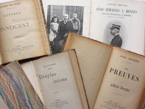 « Bordereau ». Qq. rousseurs. • AJALBERT. Qq. Dessous du Procès de Rennes. Stock, 1901. In-8, reliure à la Bradel demi-maroquin crème, dos lisse orné, tête dorée. Couvertures conservées (taches légères). xii-273 pp. Nombreuses illustrations (photos) à pleine page et dans le texte. • CHLRADAME (André). L’Affaire Dreyfus à l’Etranger. Paris, Imp. Levé, s. d. (1899). Plaquette in-8, brochée (bande de kraft brun au dos, scotch en marge interne). 16 pp. développant les articles publiés dans l’Eclair. • CORNELY (J.). Notes sur l’Affaire Dreyfus. Edition du Figaro. Paris, May, s. d. In-12, reliure à la Bradel demi-maroquin crème, dos lisse orné, tête dorée. (4)-643 pp. Marges jaunies. Ex-libris : Walter Furst. • DREYFUS (Alfred). Lettres d’un Innocent. P., Stock, 1898. In-12, même reliure à la Bradel que ci-dessus. 279 pp. et 2 lettres de Dreyfus en fac-similé. Papier jauni. Ex-libris : Walter Furst. • DUBREUIL (René). L’Affaire Dreyfus devant la Cour de Cassation. Edition populaire illustrée par H.-G. Ibels, Couturier et Léon Ruffe. Paris, Stock, 1899. Grand in-8, broché. Dos cassé, petites déchirures avec manques en marges de la couverture. vi-228 pp. Nombreuses illustrations et fac-similés dans le texte et à pleine page. • GRAND-CARTERET (John). L’Affaire Dreyfus et l’Image. 266 caricatures françaises et étrangères. Paris, Flammarion, s. d In-12, reliure à la Bradel demi-maroquin crème, dos lisse orné, tête dorée. 352 pp. Marges jaunies. Riche iconographie. Ex-libris : W. Furst. • IBELS (H.-G.). Allons-y ! Histoire contemporaine (1re partie) racontée et dessinée par Ibels. Paris, Stock, 1898. In-8, reliure à la Bradel demi-maroquin crème, dos lisse orné, tête dorée. 111 pp. Edition réunissant les dessins de Ibels parus dans le Sifflet. • JAURÈS (Jean). Affaire Dreyfus. Les Preuves. Paris, La Petite République, s. d. (1898). In-12, même reliure à la Bradel que ci-dessus. Couv. conservées. (4)-xv-294 pp. Articles publiés dans La Petite République. Ex-libris : W. Furst. • LAZARE (Bernard). Une Erreur Judiciaire. L’Affaire Dreyfus. 2e Mémoire avec des Expertises d’écritures. Paris, Stock, 1897. In-12, même reliure à la Bradel que ci-dessus. (6)-303 pp. et une planche hors texte dépliante. Très nombreux fac-similés. Ex-libris : Walter Furst. • PRESSENSL (Francis de). Un Héros. Le Capitaine Picquart. Paris, Stock, 1898. In-12, même reliure à la Bradel que ci-dessus. Frontispice, xv-385 pp. Marges jaunies. Ex-libris : Walter Furst. • [PROCÈS]. La Révision du Procès Dreyfus à la Cour de Cassation. Compte Rendu sténographique «in extenso» (27, 28 et 29 Octobre 1898). Paris, Edition de l’Aurore, 1898. In-12, même reliure que ci-dessus. (4)-271 pp. Ex-libris : Furst. • ROGÈS (Louis). L’Affaire Dreyfus. Cinq Semaines à Rennes. 200 photographies de Gerschel. Paris, Juven, s. d. In-8, même reliure à la Bradel que ci-dessus. Couvertures conservées. (4)-xxiv-191 pp. (photos) et 3 ff. de table. • VILLEMAR (H.). Dreyfus Intime. Paris, Stock, 1898. In-12, même reliure à la Bradel que ci-dessus. 76 pp. • ZOLA (Emile). Les Lettres de M. Emile Zola et les Poursuites. Paris, Fasquelle, 1908. In-8, même reliure à la Bradel que ci-dessus. 590 - 2 bl.- 464 pp. Pas de page de titre, déchirures sur 1 f.