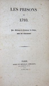 GIRARDIN (Sophie Victoire Alexandrine de, Comtesse de Bohm). Les Prisons en 1793. Paris, Bobée et Hingray, 1830. In-8, reliure postérieure demi-chagrin brun, dos à 5 nerfs orné de filets dorés. Qq. légers frottements sur un mors. viii-312 pp....