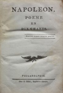[LORQUET (Hubert Louis)]. Napoléon, Poeme en dix Chants. Philadelphie [Port-Louis], G. Tell, s. d. (1822). In-8, reliure demi-basane fauve, dos lisse orné de fleurons dorés. Mors supérieur légèrement fendillé sur qq. cm. Titre, (4)-203 pp. Qq....