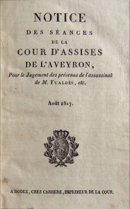 PROCÈS FUALDÈS. Réunion de 3 vol. dont un manuscrit : T. 1 : Notice des Séances de la Cour d’Assises de l’Aveyron . Rodez, Carrère . Cour d’Assises du Tarn . Débats Publics. Toulouse, Vieusseux, 1818. T. 2 : Mémoires de M. Clémandot ....