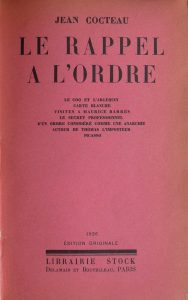 œuvres critiques (1918-1926) de Jean Cocteau : Le Coq et l'Arlequin, Carte blanche, Visites à Maurice Barrès, Le Secret professionnel, D'un ordre considéré comme une Anarchie, Autour de Thomas l'imposteur, Picasso. Tirée à 685 ex. numérotés dont celui-ci, un des 550 ex. sur pur fil du Marais.