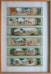 LANTERNE MAGIQUE. Don Quichotte. Fin XIXe s. Série de 6 plaques peintes à la main, représentant des scènes numérotées de 1 à 6. Qq. usures. Série complète parfaitement présentée dans un cadre à double paroi de verre.
