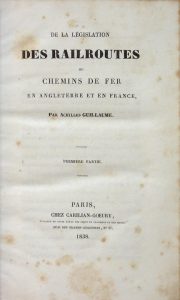 [TRANSPORTS]. GUILLAUME (Achilles). De la Législation des Railroutes ou Chemins de fer en Angleterre et en France. Paris, Carilian-Gœury, 1838. 2 parties en un volume in-8, reliure de l’époque demi-veau chamois, dos lisse orné. Petites...