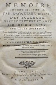 PARMENTIER (Antoine-Augustin). Mémoire Couronné le 25 août 1784, par l’Académie Royale des Sciences, Belles Lettres et Arts de Bordeaux, sur cette question : Quel serait le meilleur procédé pour conserver, le plus long-temps possible, ou en...