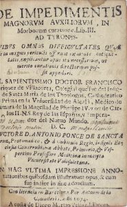 PONCE de Santa Cruz (Antonio). De Impedimentis magnorum auxiliorum, in morborum curatione lib. III . Barcelona, per Antonio de la Cavalleria, a costa de Diego Martin Vellaz librero, 1674. In-12, reliure XVIIIe s. basane brun marbré, dos lisse orné....
