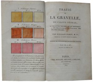 In-8, reliure de l’époque demi-basane fauve, dos lisse orné de filets dorés. Qq. épidermures. Frontispice, xxx et 9-312 pp. Qq. rousseurs sur les premiers et derniers ff. Le frontispice rehaussée à l’aquarelle représente les « principales couleurs propres aux sédiments » ou dépots urinaires. Édition originale de la traduction française par Charles Louis Mourgué.