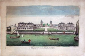 [LONDRES]. Vue d’Optique. Hospital Greenwich sur la Thamise. Paris, Daumont, s. d. (v. 1760). Gravure sur cuivre (25 x 42 à la cuvette) en coloris d’époque. Bon état. Légende en marge inférieure : Vue de l’Hospital Greenwich, sur la...