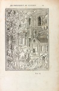 Édition originale du traité d'architecture le plus important de son temps, chef-d'œuvre du promoteur de la Renaissance en France. # Exemplaire de seconde émission, coiffé d'un titre de relai à la date de 1568. # À la différence des traités antérieurs, le traité de Philibert de l'Orme s'adresse, non à l'humaniste, mais à l'architecte de son époque, sorte de bâtisseur érudit et dont Delorme désire qu'il soit comme Vitruve « rhetoricien, philosophe, arithmeticien, geometrien, astrologue, musicien, peintre, jurisconsulte, & medecin ». Le second tome ne vit jamais le jour. # Monumental, l'ouvrage est illustré d'un titre architectural et de plus de 200 figures dans le texte finement gravés sur bois, dont 74 à pleine page et 7 à double page. # Exemplaire incomplet des feuillets 265-266 (Bbb1-2), ainsi que du feuillet blanc ê6 et, comme presque toujours, des 2 ff. finaux (Eee5-6). Décor des plats rapporté postérieurement. Deux dessins anciens à la plume sur les dernières pages. Ex-dono moderne sur une garde. Mors fendus, coiffes manquantes, mouillures et taches éparses, rares feuillets anciennement raccomodés. # BAL, II, n°1955 – Fowler, n°99.