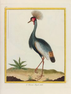 Somptueux recueil de planches d'oiseaux enluminées d'un vif coloris d'époque. # On trouve dans la présente collection – reliée sans le texte de l'Histoire naturelle des oiseaux par Buffon et Philippe Guénéau de Montbeillard, comme souvent – les planches nos1 à 288 des 1008 qui furent imprimées pour l'ouvrage, parmi lesquelles 253 représentent des oiseaux et 35 des sujets non ornithologiques : insectes, madrépores, etc. # Superbes et d'une grande précision, elles sont quasiment toutes l'œuvre de François-Nicolas Martinet. Dessinés d'après les spécimens naturalisés du Cabinet du roi et finement gravées en taille-douce sous la direction d'Edme-Louis Daubenton, ces planches furent « enluminées » avant la publication et encadrées d'une bordure à l'aquarelle jaune. # Très bel exemplaire dans une jolie reliure en maroquin rouge à dentelle (insignifiantes restaurations). # Planches d'une grande fraîcheur, au coloris profond et nuancé. # Ex-libris armorié aux initiales CFVM. # Nissen : IVB, n°158 – Ronsil, n°413 – Zimmer, 104 – Anker, n°76 – Brunet, I, 1379.