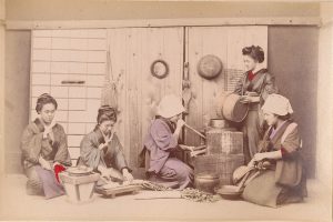 Joli recueil de 24 clichés photographiques originaux en tirage albuminé colorié. # L'album est constitué en leporello de 12 panneaux sur lesquels les photographies ont été contrecollées recto-verso, avec d'un côté les vues de monuments et de villes et de l'autre les scènes de genre et les costumes traditionnels japonais. # Il est conservé entre deux ais de bois épais, auparavant recouverts d'étoffe brodée, mais dont il ne subsiste que des restes effilochés.