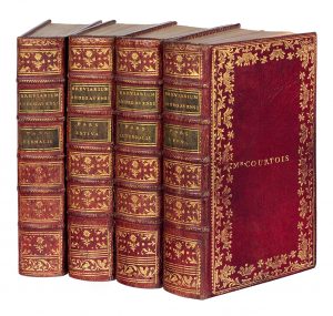 Bréviaire angevin en quatre parties, une pour chaque saison de l'année, publié sous l'autorité de Jean de Vaugirault, évêque d'Angers de 1731 à 1758. # L'édition est ornée d'un frontispice, répété dans chaque volume, et de 17 figures hors texte gravées sur cuivre. # Bel exemplaire en maroquin à dentelle orné du supralibris doré de M. Courtois, qui a signé au-dessus d'un frontispice : Le Prieur Courtois. # On y joint : L'Office du matin. Partie d'Été. – Partie d'Hiver. Paris, chez les libraires associés, 1777. – L'Office du soir. Ibid., id., 1781. 3 volumes in-12, maroquin rouge à long grain, roulettes dorées, dos lisse orné, roulette intérieure, tranches dorées (Reliure vers 1800). Légers frottements aux reliures, menus défauts intérieurs.