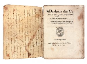 COTTEREAU (Claude). Du devoir d'un capitaine et chef de guerre. Aussi du combat en camp cloz, ou duel. Poitiers, à l'enseigne du Pélican [Jean et Enguilbert de Marnef], 1549. In-4, couverture de vélin de réemploi (Reliure de l'époque).