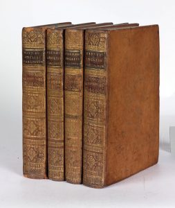 volumes in-4, veau fauve, dos lisse joliment orné d'un fer à l'oiseau répété, pièces de titre brune et de tomaison havane, filets sur les coupes, tranches jaspées (Reliure du XVIIIe siècle).