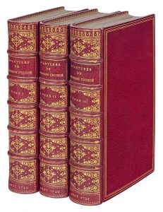Édition originale de la première traduction française, par Justus van Effen et Thémiseul de Saint-Hyacinthe. # Elle est illustrée d'une carte dépliante intitulée Mappemonde ou carte générale de la terre, sur laquelle est tracé le voyage de Robinson Crusoë, de 21 figures hors texte dessinées et gravées sur cuivre par Bernard Picard, dont seul le portrait de Robinson Crusoe placé au frontispice est signé, et d'un joli fleuron gravé sur cuivre par le même artiste répété au titre de chaque volume. # « Les gravures qui ornent cette édition sont celles qui ont presque toujous été copiées, plus ou moins heureusement, dans la plupart des éditions postérieures : il convient de remarquer à quel point elles sont merveilleusement en harmonie avec le texte qu'elles illustrent, et font ainsi de cet ouvrage, capital quant au texte, un des plus beaux livres de voyages à figures du xviiie siècle » (Gumuchian). # Très bel exemplaire en maroquin bordeaux de Hardy, ancien ouvrier de Niédrée qui signa ses créations de son nom entre 1850 et 1880. # La Mappemonde n'a pas été répétée dans les deuxième et troisième tomes de cet exemplaire. # Brunet, II, 566 – Cohen, 404 – Gumuchian : Livres de l'enfance, n°4793.