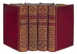 Exemplaire composite, mais bien complet des quatre tomes, reliés presqu'à l'identique au début du XVIIIe siècle. # Superbe exemplaire réglé en maroquin rouge de l'époque. # Du cabinet de Monseigneur l'évêque de Meaux, Jean-Louis de la Marthonie de Caussade (1712-1779), avec ex-libris dans le deuxième tome ; puis de la bibliothèque Ludovic Froissart, avec ex-libris. # Tomaison hasardeuse au dos des deux premiers volumes (resp. "V" et "1-2").