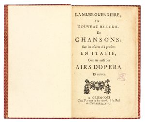 MUSE GUERRIÈRE (La), ou nouveau recueil de chansons, sur les affaires d'à présent en Italie, comme aussi des airs d'opéra, et autres. Crémone, Pasquin le Savoyard, 1703. – Suite de la Muse guerrière. Ibid., id., 1703. 2 parties en un volume...