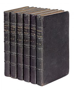 Édition originale. # Séduisant exemplaire, réglé et divisé en six minces volumes établis en maroquin noir janséniste. # De la bibliothèque Ludovic Froissart, avec ex-libris. # Menus défauts aux reliures, quelques petites rousseurs.