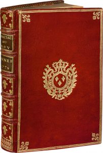 Édition originale, donnant le Journal des spectacles de la Cour pendant l'année 1774 et trois pièces, sous pagination et titre particuliers : L'Union de l'amour et des arts, ballet héroïque en trois entrées par Le Monnier, Henri iv, drame lyrique en trois actes et en prose par de Rozoy, et enfin La Partie de chasse de Henri iv, comédie en trois actes et en prose par Collé. # Très bel exemplaire en maroquin rouge aux armes de Louis XVI. # Coiffe inférieure refaite.