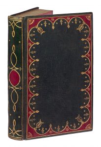 dos lisse orné en long de cordelettes dorées et d'une mandorle centrale de maroquin rouge mosaïqué, coupes et chasses décorées, doublures et gardes de papier rose, tranches dorées (Reliure de l'époque).