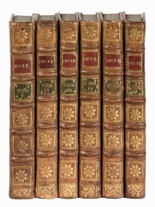 Première édition parue en France de la Nouvelle Héloïse, dite « édition Robin », imprimée par ordre de Malesherbes, avec des modifications, pour être commercialisée dans le royaume pendant que l'édition originale, publiée peu de temps auparavant à Amsterdam, chez Marc Michel Rey, était diffusée en Allemagne, en Hollande, en Angleterre et en Suisse. # Rousseau narre cet épisode dans le livre X de ses Confessions, évoquant « M. de Lamoignon de Malesherbes, premier président de la cour des aides, chargé pour lors de la librairie, qu'il gouvernait avec autant de lumières que de douceur, et à la grande satisfaction des gens de lettres ». # Très élégant exemplaire en fine reliure de l'époque, enrichi de la suite de 12 figures de Gravelot gravées en taille-douce par Saint-Aubin, Le Mire, Choffard, Ouvrier, Lempereur, Aliamet et Flipart. Cette première illustration réalisée pour La Nouvelle Héloïse fut immédiatement copiée par les graveurs Frankendaal et Folkema pour être ajoutée à l'édition d'Amsterdam. # Manques infimes sur deux coiffes et minimes restaurations, usures aux coins. # Dufour, n°90 – Tchemerzine, V, 539-540a.