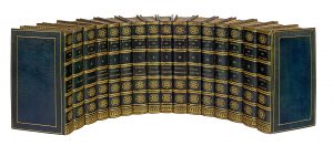 LE SAGE (Alain-René). Œuvres choisies. Paris, Leblanc, 1810. 16 volumes in-8, maroquin bleu à grain long, treillis de filets à froid en encadrement sertis de deux filets dorés, dos orné de fleurons dorés, tranches dorées (Simier R. du Roi).
