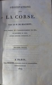 Beaumont (Baron de) Observations sur la Corse. 2ème éd. - Paris, Pelicier, 1824 - in-8 : 216 p. - demi-veau fauve, dos lisse orné à froid et doré. (quelques piqûres, dos frotté). La première édition est de 1822.