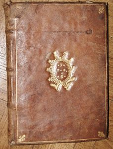 centre des plats fleuron ovale contenant l'inscription « S.P.A.S. ». (travaux de vers marginaux en tête et en queue, petites mouillures marginales, petits manques de cuir à la reliure et épidermures, dos insolé, sans coiffe). Copie des Heroides, un peu à l'imitation de celles d'Ovide, d'Hélias Eoban (1488-1540), l'un des grands poètes allemands néo-latins du Xvi ème siècle dont Albrecht Dürer adonné un portrait, publiées pour la première fois en 1514. On trouve au verso du plat supérieur, un petit fragment de feuillet de parchemin écrit en lettre de somme (Xiii ème-xivème siècles) où le De Trinitate de Saint Augustin est mentionné.