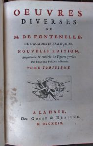 Fontenelle (Bernard de) Œuvres diverses. Nouvelle édition, illustrée par Bernard Picart - La Haye, Gosse et Neaulme, 1728 - 3 volumes in-4: bandeaux et culs-de-lampe, 6 planches hors-texte ycompris le titre-frontispice - veau ancien, dos orné à...