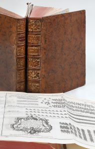 2 parties en 1 vol. in-4 de XXXXVIII-[8]-116-[6]-LXX-[16] pp. relié plein veau marbré époque, dos à nerfs à caissons fleuris, tranches rouges. Potzdam & Paris Vve Tilliard, Mérigot & Jombert le jeune 1780. Enrichi de 12 planches dépliantes de manœuvres & d'1 table dépliante.