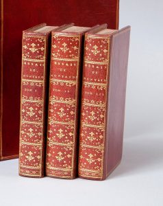 3 vol. in-12 de (26) ff. y compris le portrait-frontispice gravé, 468 pp. pour le vol. 1 ; (2)ff.-708 pp. pour le vol. 2 ; (1)ff.(sur 2, la pp. de titre mq.) 510 pp. (39)ff. de table pour le vol. 3. reliés maroquin rouge, dos lisse finement orné de filets, fleurons & motifs dorés, triple encadrement de filets dorés sur les plats, filet doré sur les coupes, roulette intérieure de même, doublures et gardes de tabis bleu ciel, tranches dorées. Edition ornée d'un très beau titre-frontispice gravé du portrait de Montaigne gravé par P. Clouwet. À Amsterdam chez Anthoine Michiels [Bruxelles Foppens] 1659.