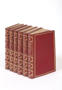 pied, triple filet doré d'encadrement dont 1 écarté, sur les plats, 2 filets sur les coupes, large dentelle intérieure, tranches dorées. Reliure signée Lucien MAGNIN. Paris Liseux 1879 (3 premiers vol.) & Londres s.n. 1880 (3 derniers vol.). Illustré de 20 gravures.