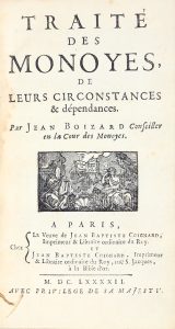 * BOIZARD (Jean) Traité des monoyes, de leurs circonstances et dépendances. 1 vol. gd in-12 de [18]-503-[20] pp. relié plein veau époque, dos à nerfs à caissons ornés. Paris Coignard 1692 (Edition Originale). Ouvrage rare. Bel ex-libris de M....