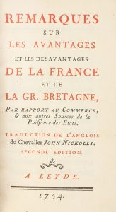 * ANONYME [PLUMARD de DANGEUL] Remarques sur les avantages et les désavantages de la France et de la Grande Bretagne, par rapport au commerce et aux autres sources de la puissance des Etats. 1 vol. gd in-12 de VI-[8]-408 pp. relié plein veau...