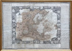 La B.N.F ne disposerait que de la carte originale de 1695 (sans cartouches). Très rare carte de Nicolas de Fer dans ce format, entourées d'une frise de 15 médaillons gravés illustrant les peuples de l'Europe tels que les Turcs, Moscovites, François, Portugais…