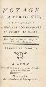caissons fleuris. Lyon Frères Duplain 1756. Première édition française du rare supplément du Voyage autour du monde de Anson. Ex-libris manuscrit. Bel ex.
