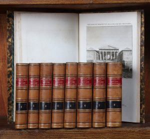 * BARTHELEMY Voyage du jeune Anacharsis en Grèce. 8 vol. in-16 de VIII-392-361-371-383-411-416-413-465 pp. reliés ½ basane fauve, dos à nerfs, pièce de titre rouge, tomaison verte. Paris Berquet 1825. Avec 7 frontispices & 1 grande carte...