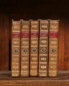 * COLLECTIF Voyages en France et autres pays. 5 vol. in-16 de [11]-204-223-237-218-300 pp. reliés plein veau raciné époque, dos lisse à caissons ornés. Paris Chaumerot 1808 (Edition Originale). Avec 4 frontispices & 30 gravures. Recueil de...
